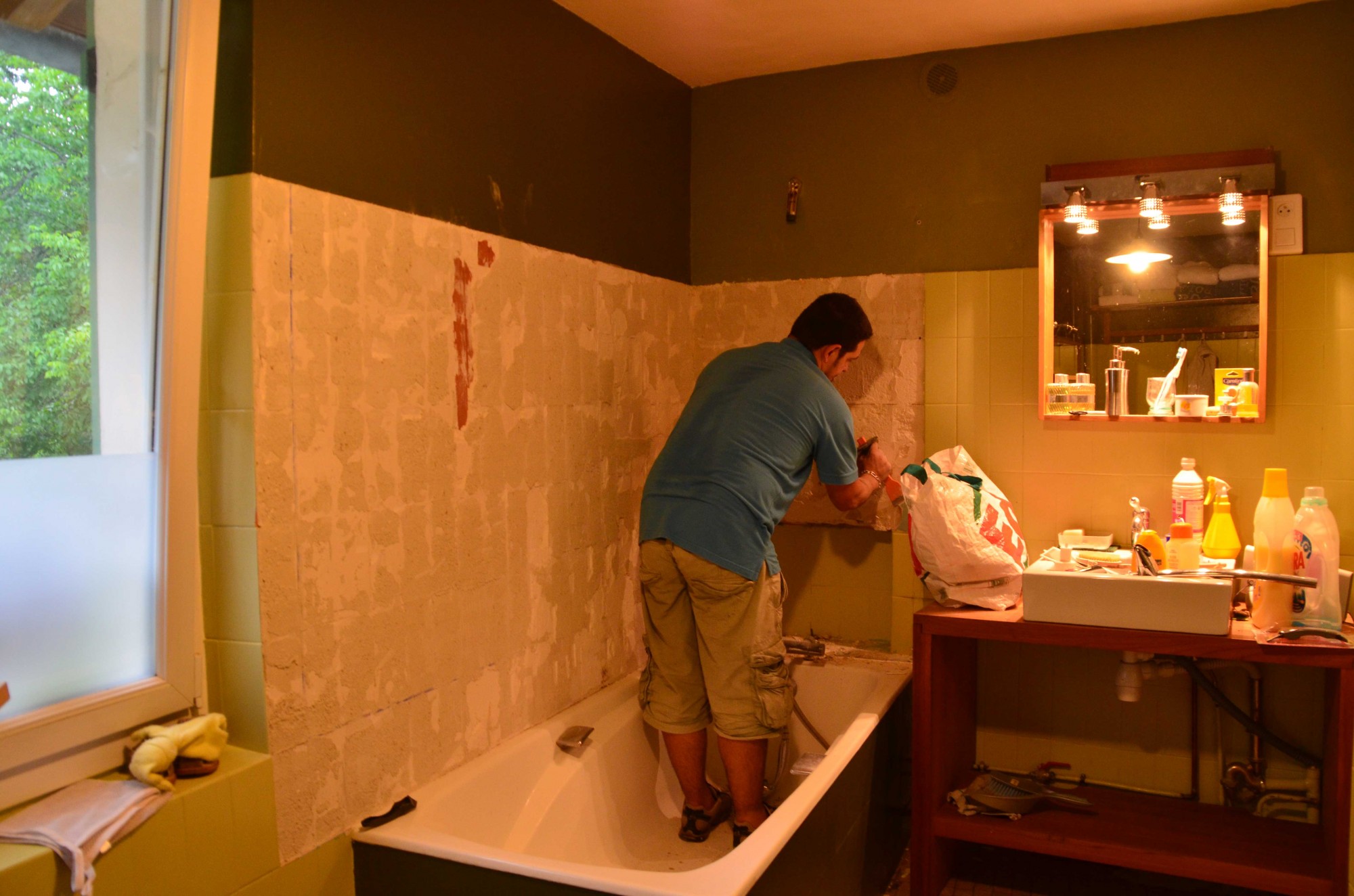 Retour à la maison, on plaque donc les murs avec des trucs machins bidules choses exprès pour la Salle de Bain, ça s’est fait… On est donc prêt à carreler, ouais cool… on adore faire du carrelage…