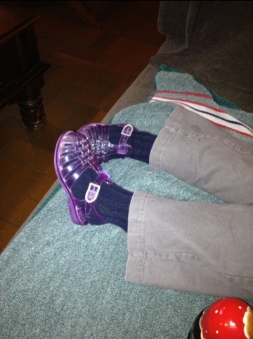 Pour le moment Pipi 4 / Louis 0 mais on ne désespère pas on va y arriver…Chaussons remplacés pas les magnifiques sandales ornées de chaussettes… Bah oui les chaussons sont pas étanches 🙂
