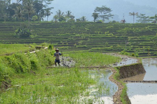 On commence direct à 09:00 par une marche à bonne allure, à travers les rizières, à nouveau les paysages sont magnifiques! On s’arrête dans une école distribué des crayons de couleurs, les enfants paraissent ‘heureux’ mais on ne sait pas vraiment, on parle pas bien le Balinais LOL