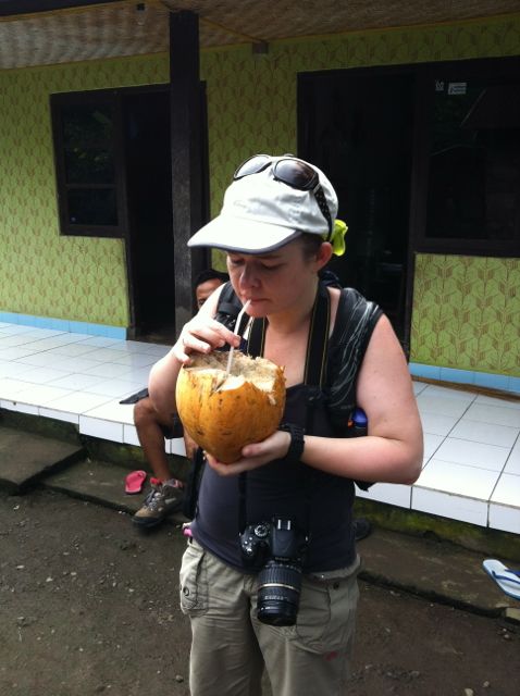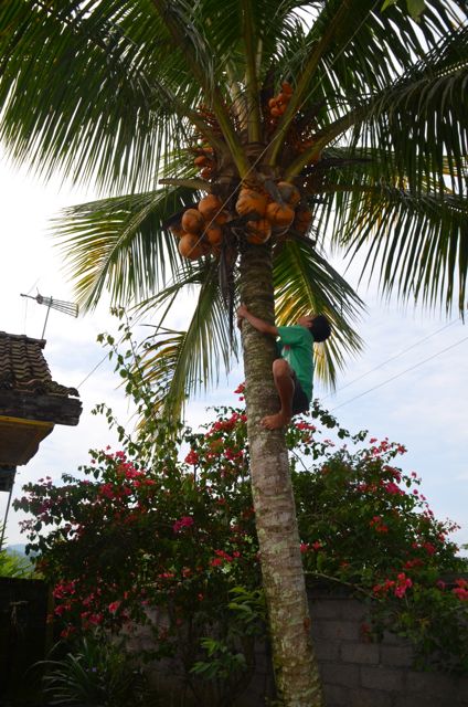 Pendant ce mini treck, on s’arrête directement chez un habitant pour demander une noix de coco… en europe, il aurait fallu sortir l’échelle mettre les chaussures monter, blablablabal! A Bali, tu demandes une noix de coco, et tu vois le gamin de 11 ou 12 ans en short et pieds nus, entourer le cocotier de ses bras et de ses jambes et roule ma poule, je monte te chercher une noix de coco! Il fait tout cela avec une facilité déconcertante! mais c’était bien bon!