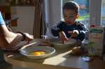 Pis alors au moment du dessert, ils sont sortis de table, retour en cuisine pour préparer du « pain perdu », tous les 2, première fois pour Louis… Tremper le pain dans le lait, le tremper à nouveau dans les oeufs, et zou à la poêle avec pleins pleins de sucre… trop bien!