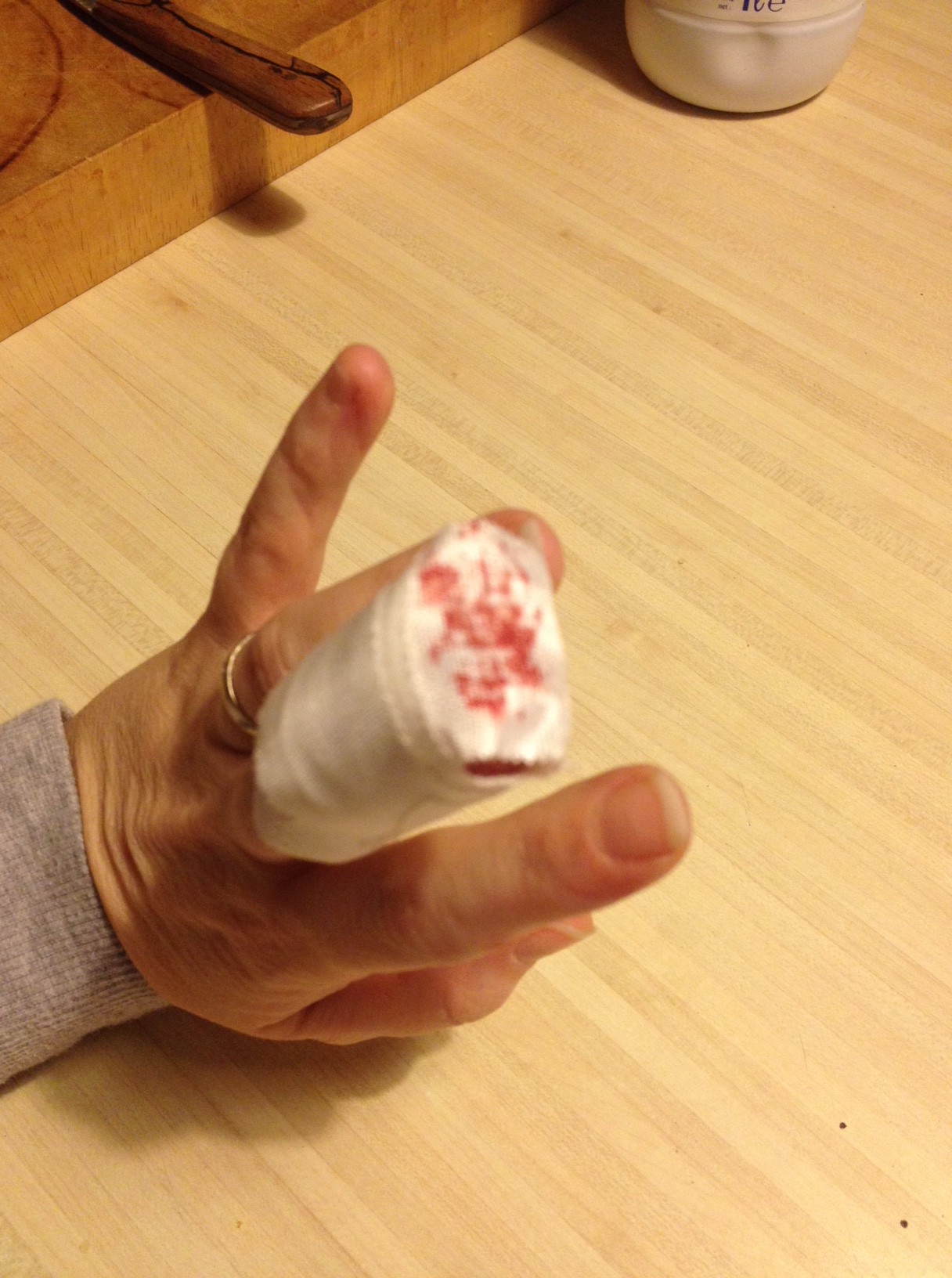 J’ai fait un super achat à la boutique PFAFF: un cutter rotatif… il coupe sa race et même les doigts et les ongles le con… Je découpais mon jersey… Et zip le cutter, l’ongle, le doigt… J’ai failli tourner de l’oeil tellement ça a tranché en une seconde… J’ai couru me coller le doigt sous l’eau froide et du haut de mes quasi 35 ans j’ai appelé mon mari qui était dans le jardin « chéri, j’ai coupé mon doigt… »… Bref, rassurez vous, mon sang coule à flot (quoi je me suis bourrée d’anti-coagulant le mois dernier?), ça saigne d’ailleurs encore des heures après mais beaucoup moins… Ca fait un mal de chien j’avoue, et la chair est à vif…