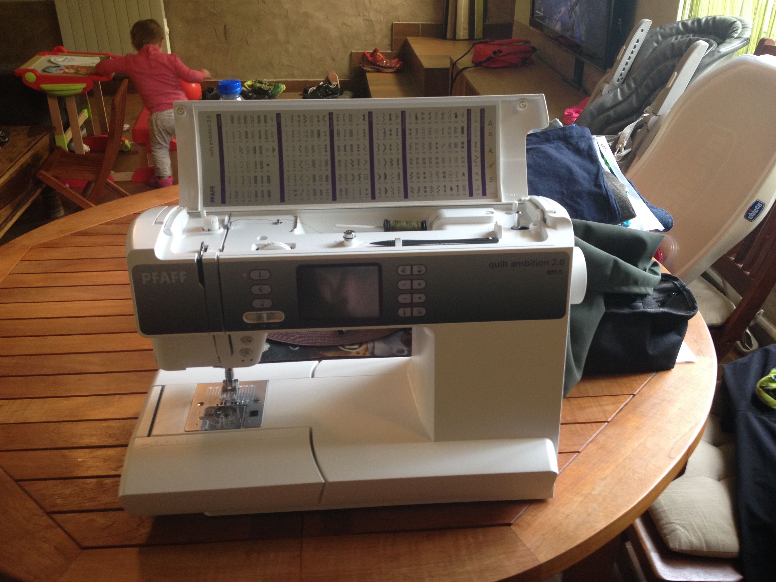 Au bout d’un an demi je me suis dit qu’il fallait changer et monter de gamme. Je couds toutes les semaines, pour les enfants, pour le mari et pour moi sauf que ma machine étant certes une Pfaff mais entrée de gamme ne me permettais pas vraiment de faire tout ce que je voulais…
