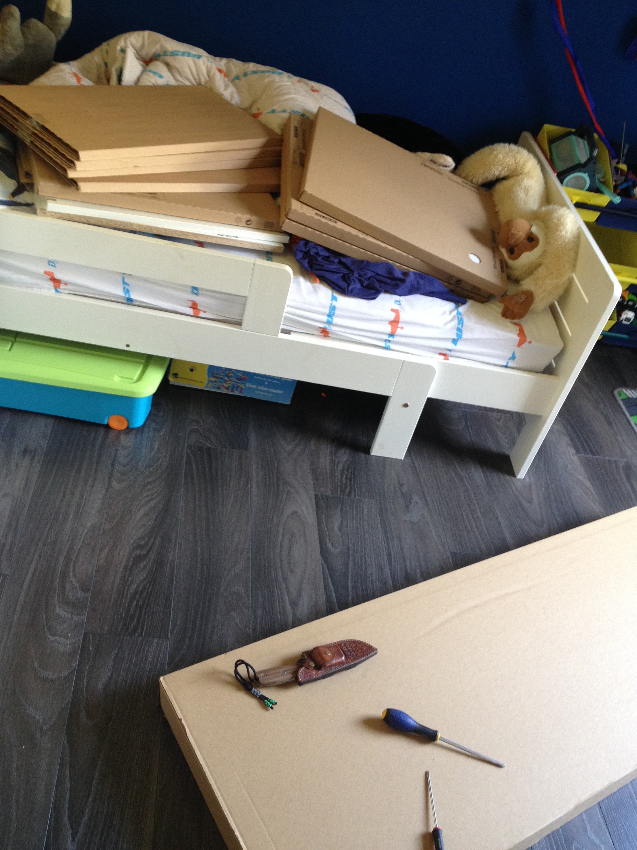 Ce n’était absolument pas prévu, normalement je devais passer la journée en tête à tête avec ma machine à coudre… Mais le sort en a décidé autrement. Hier toute la journée nous avons rangé / vidé / trié la chambre de Louis… bah oui le barbu va pas tarder donc il faut faire un peu de vide quand même… Nous avons même commencé à trié les Légos par boite (coucou Myln PDR)