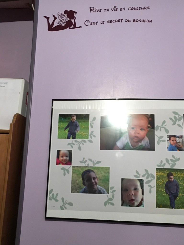Je voulais au départ le coller sur le mur de mon bureau… MAIS… mon bureau est la seule pièce de la maison que l’on n’a pas encore refaite, et j’ai eu un doute sur le collage… si ça colle trop bien, je risque d’entendre Chouchou râler très fort… (en fait il m’a dit nawak hein tu peux coller sur le mur éclate-toi!) Du coup je l’ai collé sur la porte de mon placard! Au milieu des dessins de mon fiston