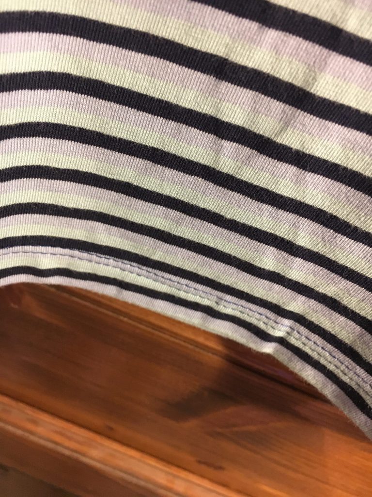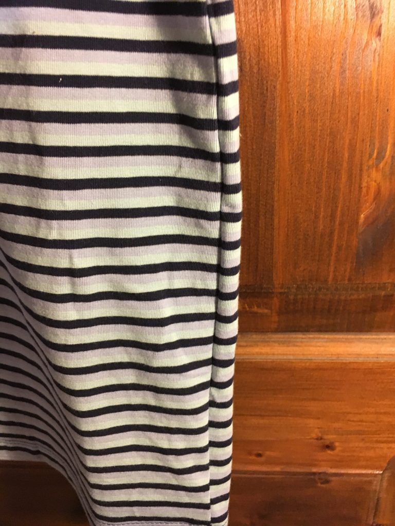 Lors d’une commande de tissus, je ne sais pas pourquoi mais j’ai commandé des kilomètres de ce jersey rayés, et j’ai du mal à l’utiliser… en plus il me fait mal aux yeux à travailler… (oui je sais je suis bizarre)… Le pire dans l’histoire c’est que j’ai exactement le même mais dans les tons « vert »…