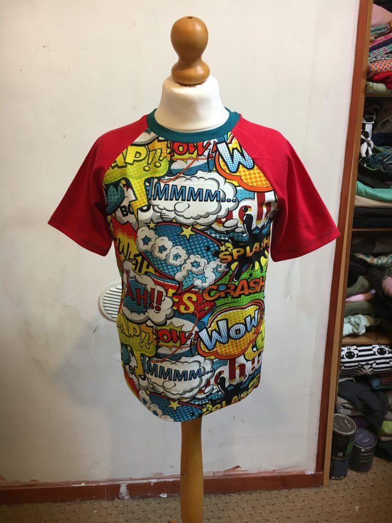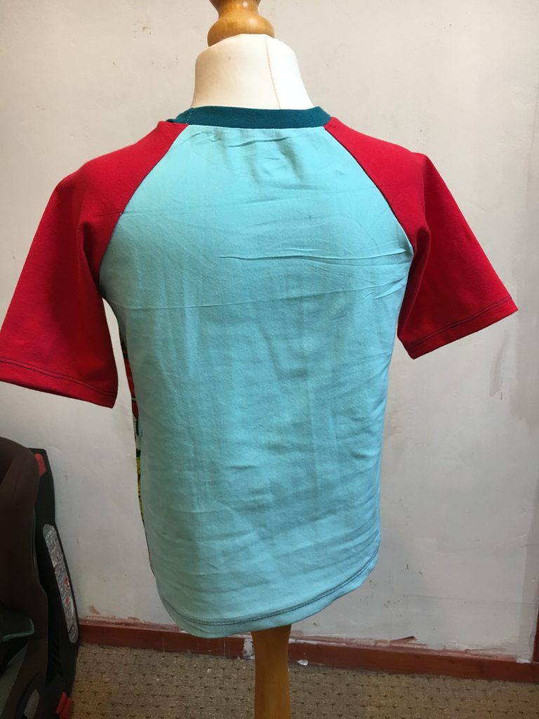 3ème modèle, Tee Shirt Manches courtes pour mon Loulou! J’ai flashé sur ce tissus, et j’ai bien fait!