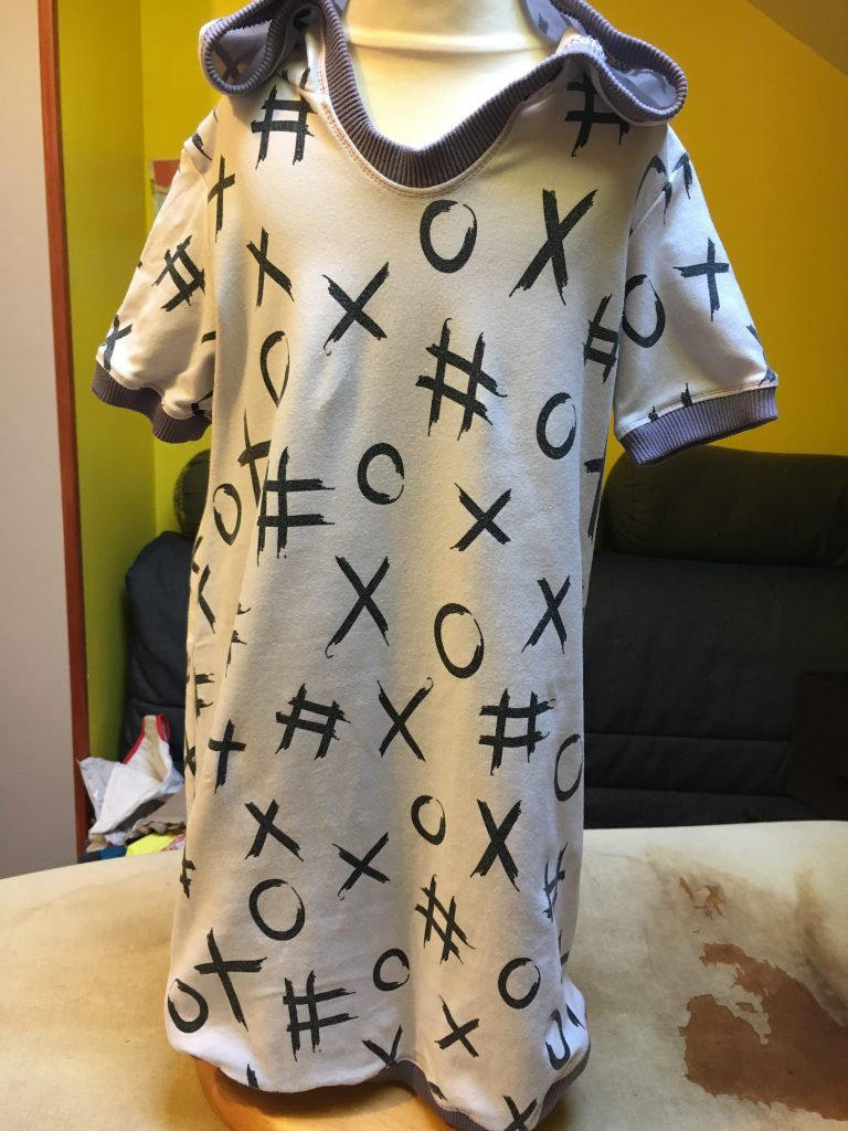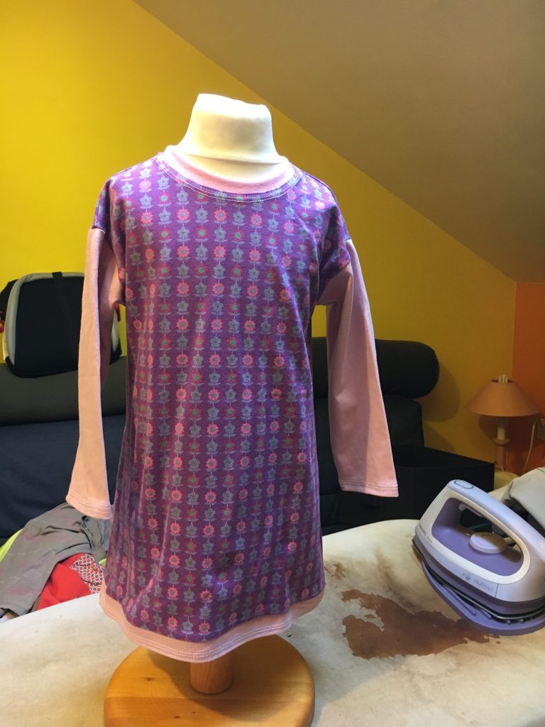 Tant que j’étais sur la petite taille, j’ai enchainé sur une deuxième Robe / Tunique. Il a fallu que je ruse car le coupon que je voulais utiliser n’était pas assez grand pour pouvoir y caser la totalité du devant et du dos (Note pour moi même, ne plus acheter de coupon de 50cm c’est trop petit maintenant)