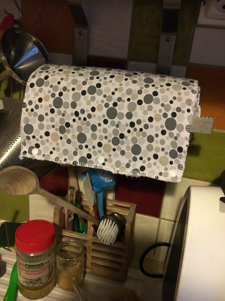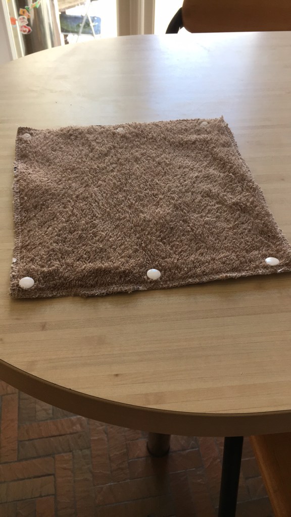 Du coton et de l’éponge, et zou c’est parti! L’éponge est une ancienne serviette de douche et le coton utilisé est un recyclage d’une housse de couette bébé de Léonie (Fait Maison il va s’en dire la Housse de Couette)