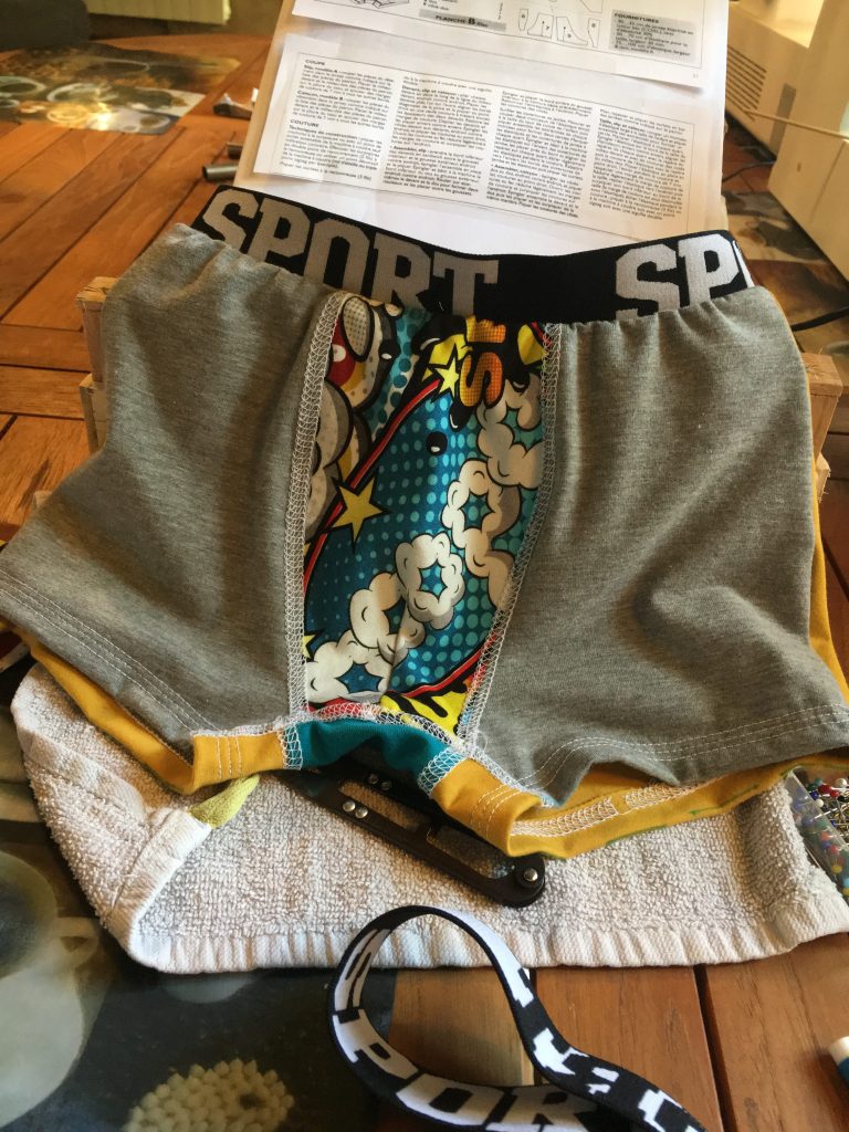 Je dois attendre le retour de l’enfant prodige pour qu’il l’essaye et que je sois sûre de la bonne taille pour pouvoir le décliner… Je profite qu’il montre pas encore son caleçon aux filles hein il va même avec des fesses roses mais on s’en fou c’est sous le pantalon 😉 et ça utilise ma boite « je garde au cas où »