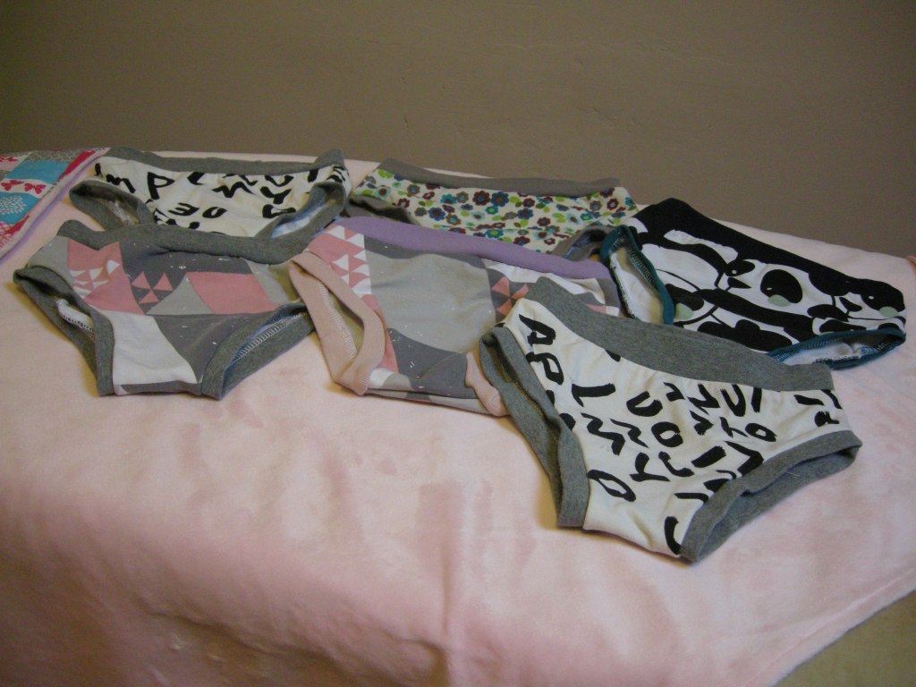 Utilisation des chutes (comme ça elle a en culotte ce que moi j’ai en tee-shirt), et montage ultra rapide à la surjeteuse.