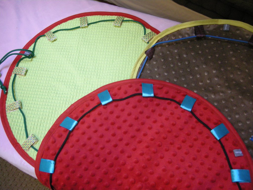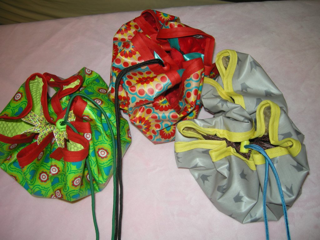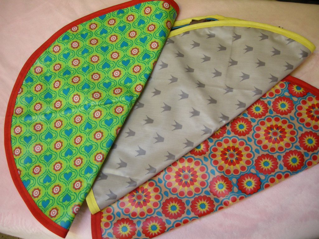 Je suis en mode « utilisation uniquement du stock » donc j’ai pioché dans les cotons enduits (non ça ne glisse pas bien au contraire) et soit du doudou, soit du nid d’abeille… et en voilà 3… Oui moi j’ai que deux gnomes, mais des fois y’à ma nièce aussi, donc pour éviter la guerre, y’en a trois! NA!