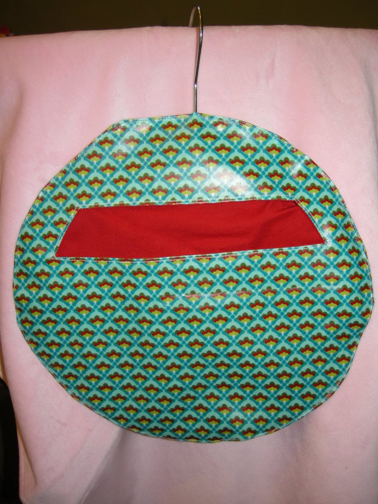 C’est un sac pour ranger les épingles à linge… Coton enduite pour l’extérieur (donc ça craint pas la pluie) et coton rouge tout simple à l’intérieur!