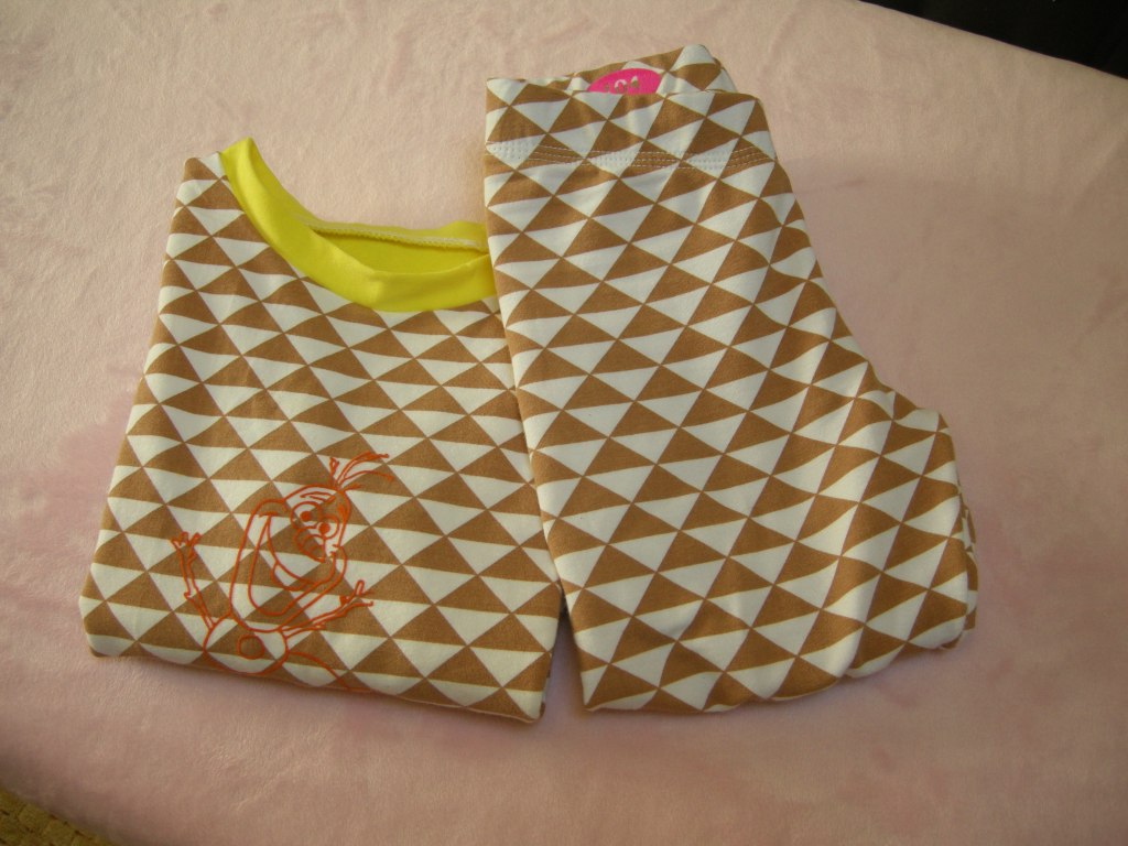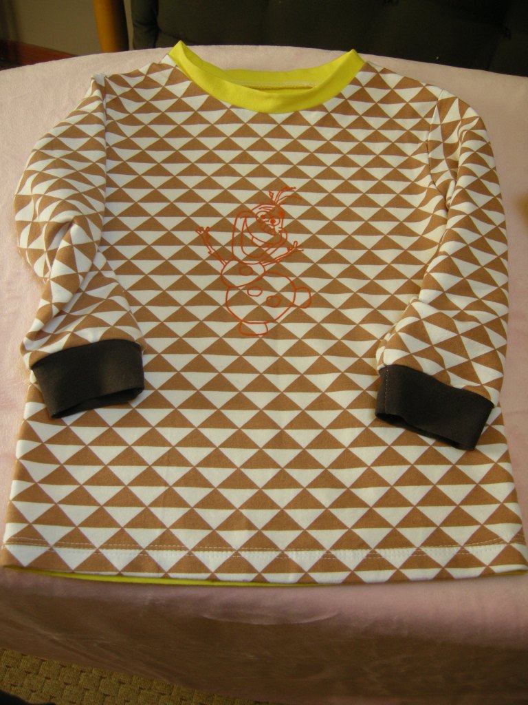 J’ai re-découpé un Tee Shirt Manche Longue de Mon Barbu et lorsque je l’ai montré à Léonie elle m’a répondu « c’est moche et c’est pas tout doux comme un pyjama »... Voilà Voilà Voilà… Va falloir que je m’y fasse elle va avoir 5 ans… Un petit Flex découpé et posé plus tard, OLAF nous a sauvé le pyjama! Le motif ne ressort pas des masses, mais ce sont des chutes, même pour le FLEX je liquide les stocks j’ai dit LOL