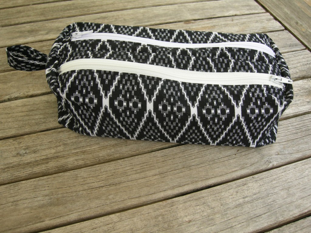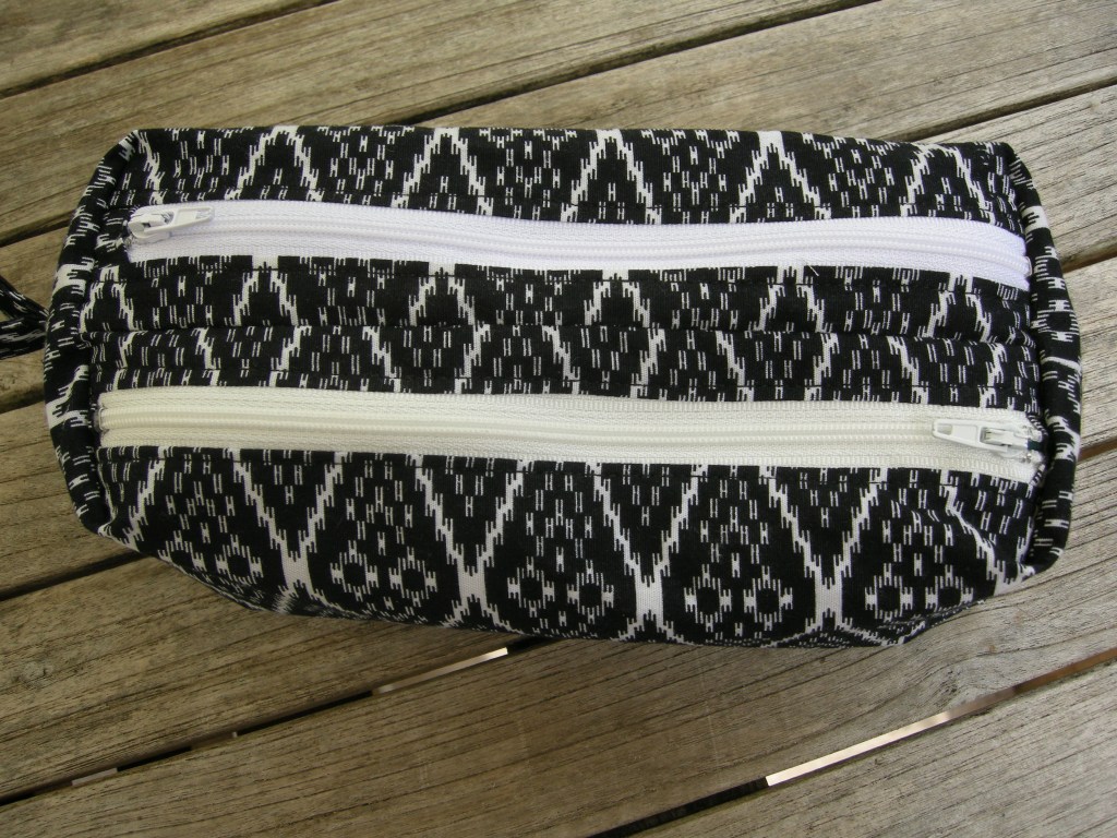 Le Tissus vient de Bangkok (oui rien que ça), j’aime bien le motif « sans motif » finalement, c’est sobre, et en ayant entoilé auparavant la trousse se tient bien.