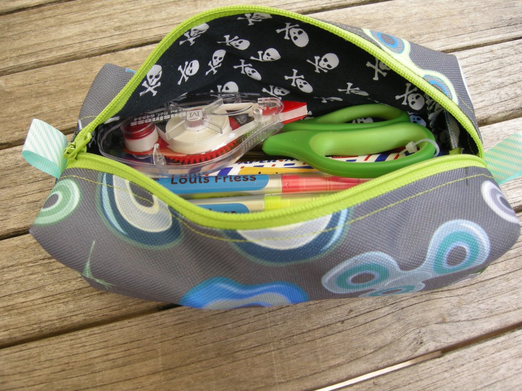 Chez nous on ré-utilise les fournitures d’une année sur l’autre, en vérifiant son matériel, j’ai vu sa trousse qui est encore en très bon état, mais qui date du CP… Puis j’ai vu aussi sa trousse à feutres qui date également du CP mais en la regardant je la trouvais un peu « bébé »… Le bébé venant de fêter ses 9 ans je me suis dit que je pouvais bien lui faire une trousse quand même… –même si je l’avoue les accessoires sont pas mon fort…–