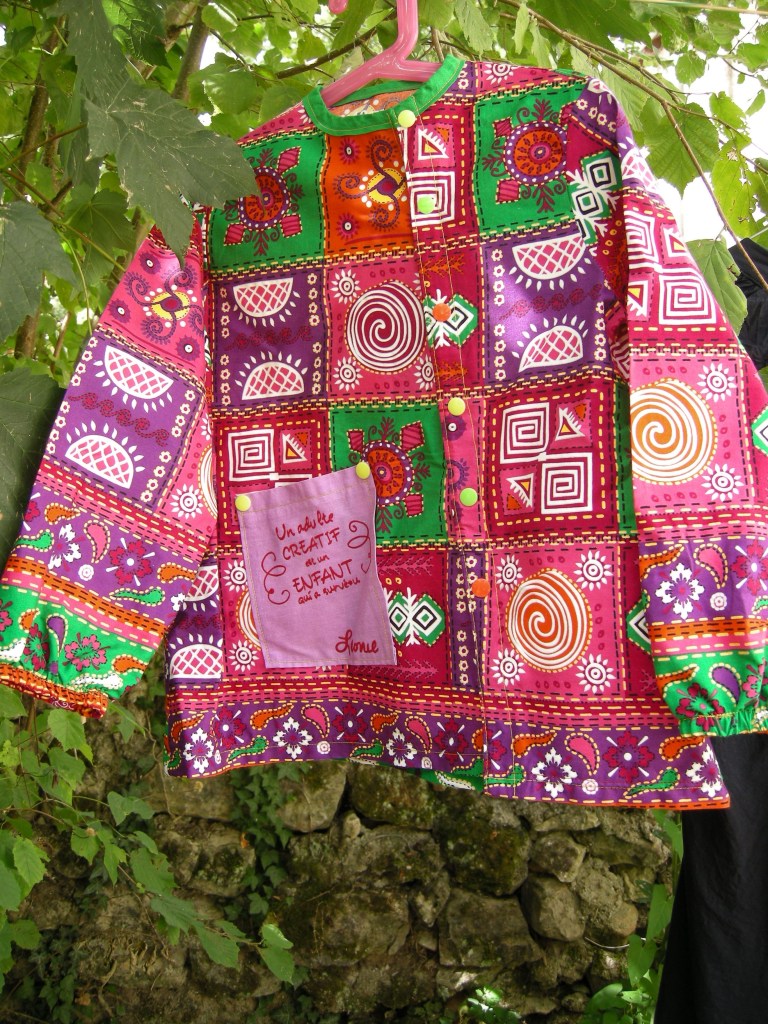 Bah moi je lui ai fait une blouse hyper funky, non mais c’est pas parce que tu fais de la peinture que tu dois être moche habillée en plastique non plus… [pis le plastique y’en a quasi plus chez moi…]