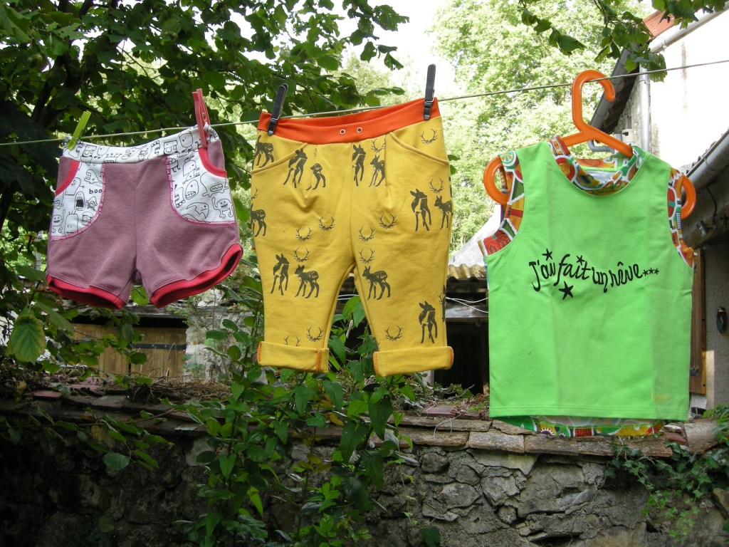 En rentrant j’ai fait du tri -encore oui- et j’ai retrouvé des patrons / tissus découpés mais non réalisés… C’est ballot surtout quand on voit que c’est des shorts / débardeurs pour l’été et que les minis sont encore en vacances jusqu’à la fin du mois…