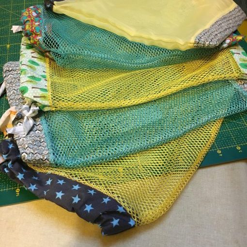 4 en filets parce qu’en fait je trouve ça joli et plus pratique au passage à la caisse, et un en voile parce que bon… je sais pas vous, mais moi le riz ou le sucre en poudre en vrac (oui ça nous arrive) dans le filet à trou, c’est pas une bonne idée, dans le sac « voile » ça sera beaucoup mieux!
