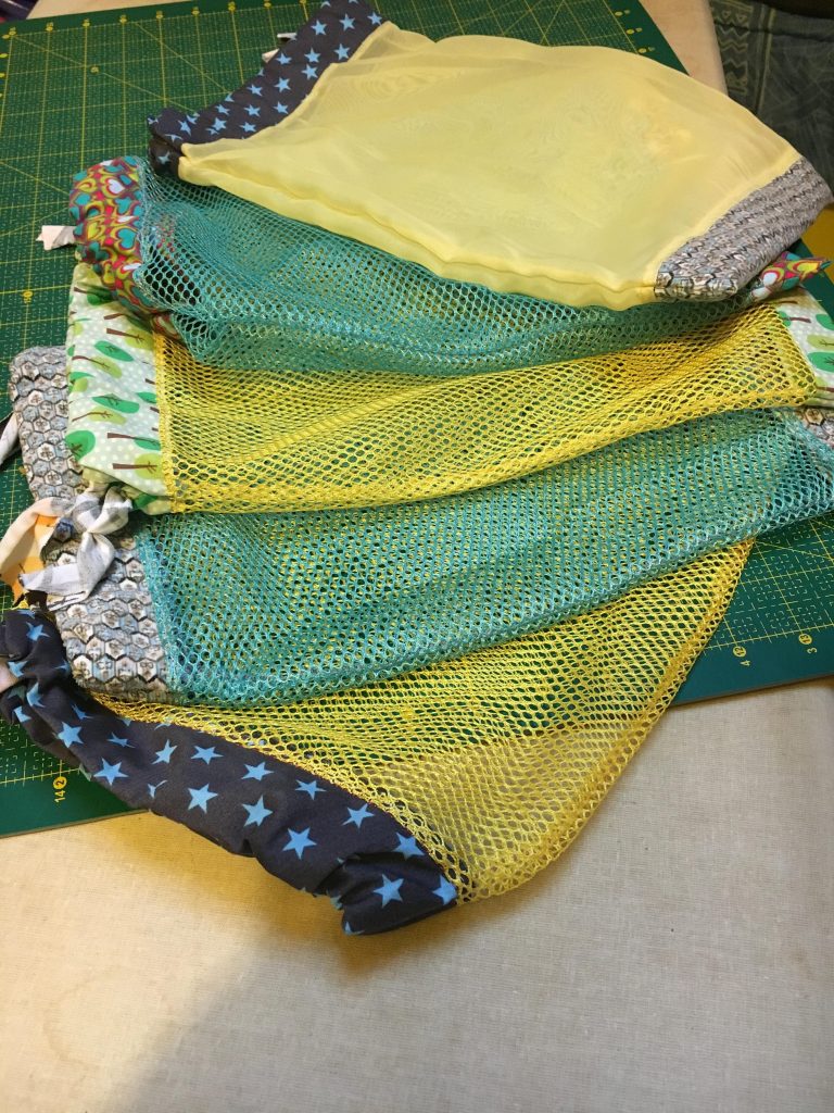 4 en filets parce qu’en fait je trouve ça joli et plus pratique au passage à la caisse, et un en voile parce que bon… je sais pas vous, mais moi le riz ou le sucre en poudre en vrac (oui ça nous arrive) dans le filet à trou, c’est pas une bonne idée, dans le sac « voile » ça sera beaucoup mieux!