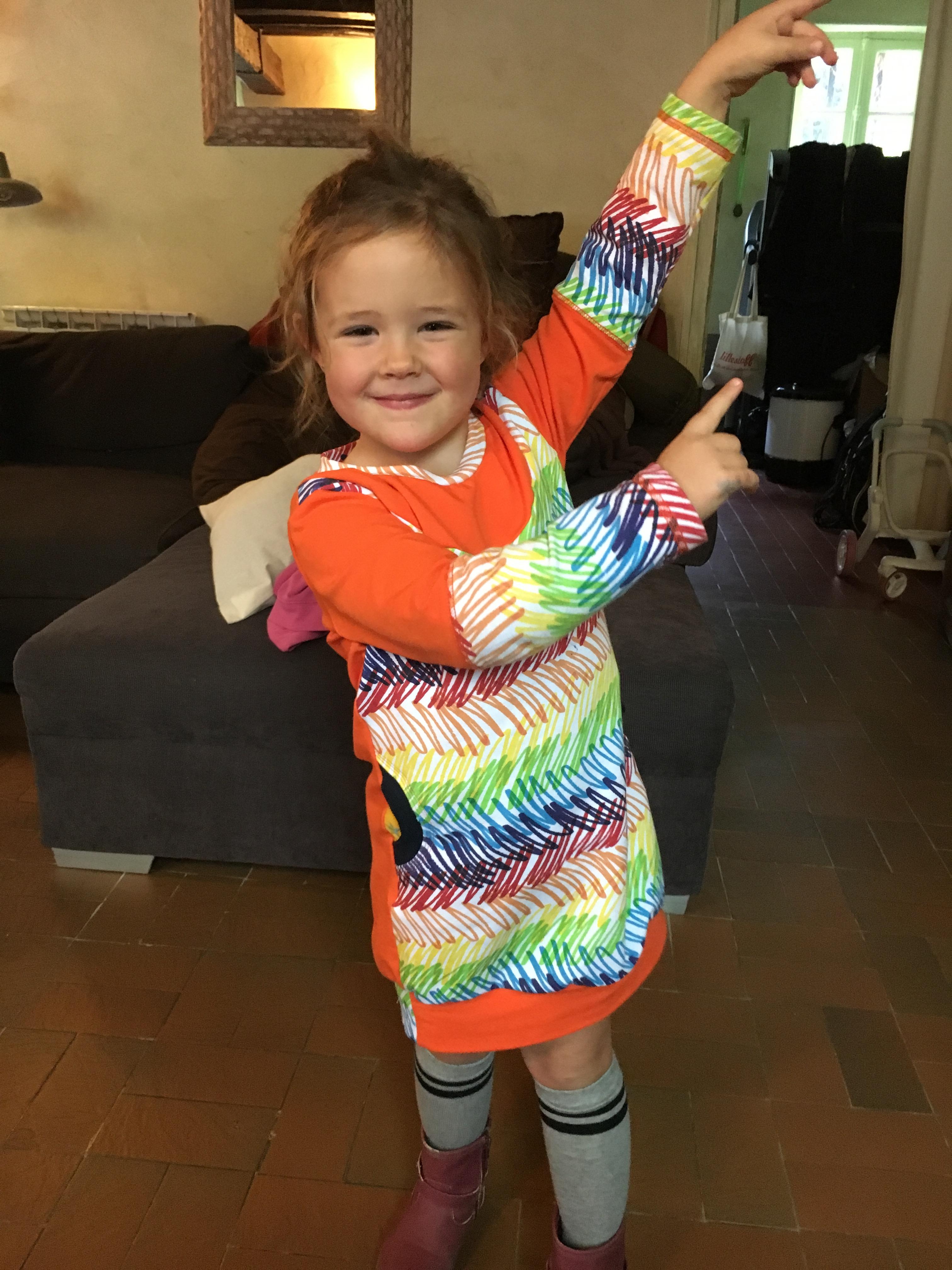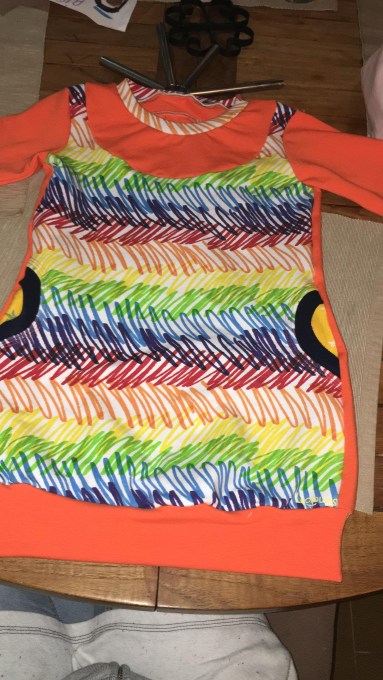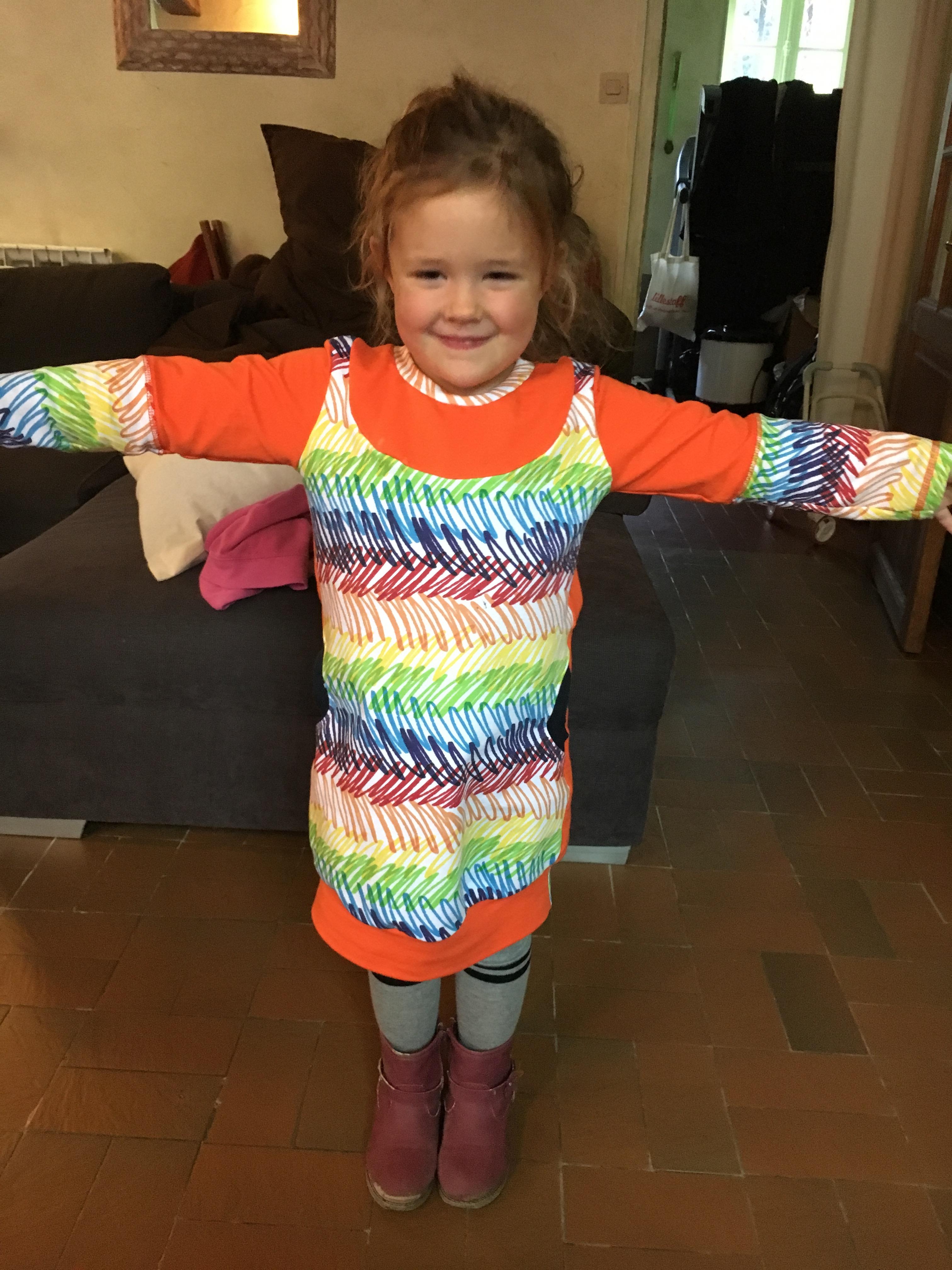 Du haut de ses 5 ans et quelques la demoiselle choisit maintenant ses tissus et j’ai interêt à m’y tenir, sinon elle me fait un rappel à l’ordre, donc ça donne des couleurs comment dire… Eclatantes!