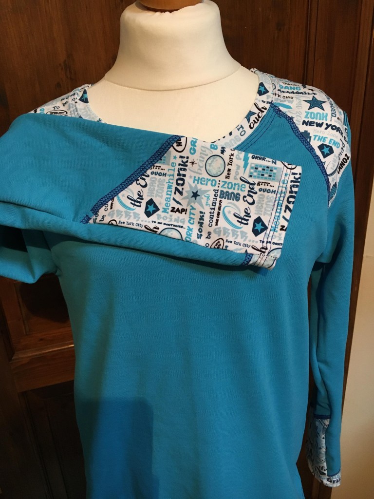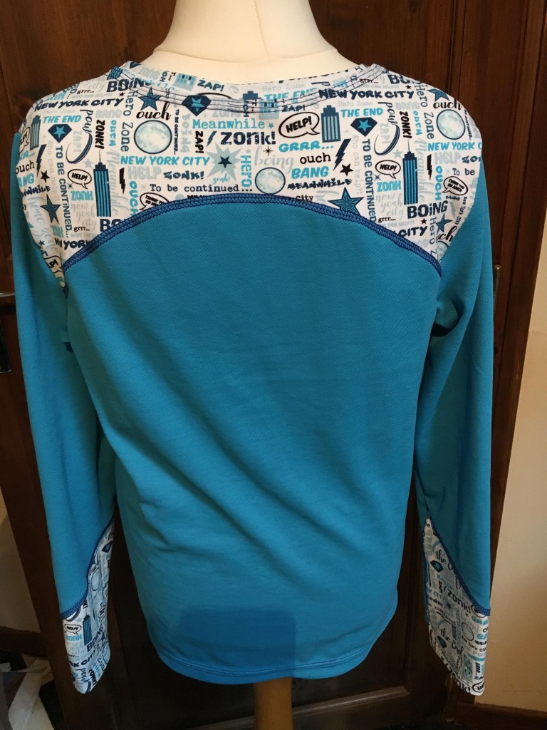 La découpe au dos permet d’utiliser pleins de chutes de tissus (là je suis sur une taille 140) et on peut aussi jouer avec les poignets