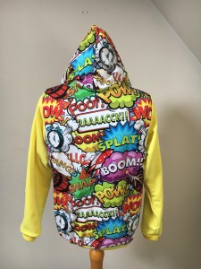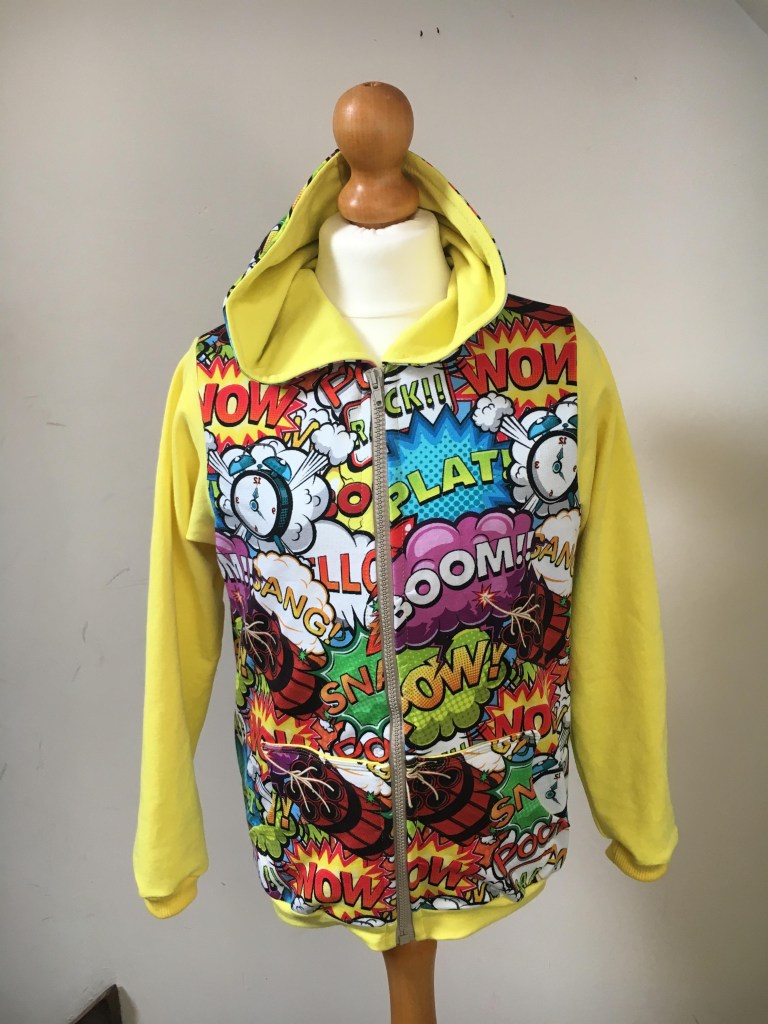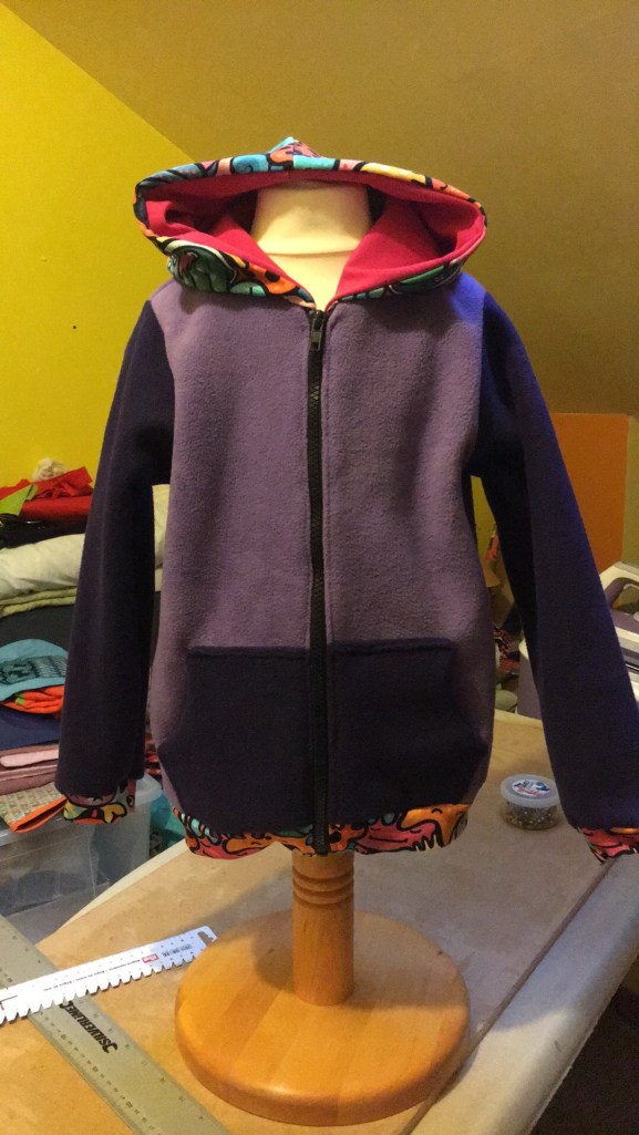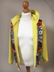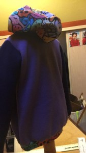 Là il est monté, il a choisi ses tissus lui même et m’a donné les directives pour la couleur des manches, l’intérieur de la capuche et tout et tout…
