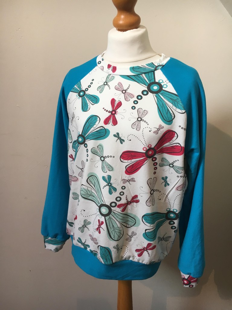 Petit sweat léger (car je sais qu’elle a toujours chaud cet enfant LoL) à manches raglans, tout en douceur de papillon et de bleu azur…