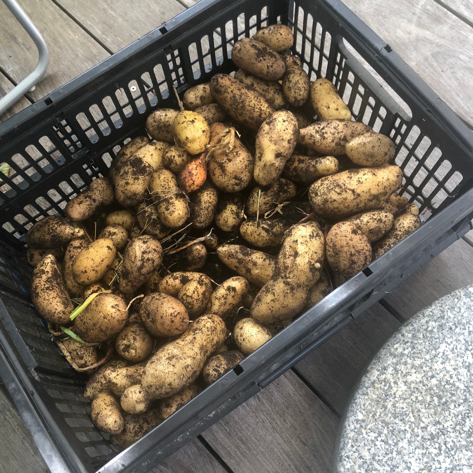 A Gauche, première récolte de nos patates et oignons