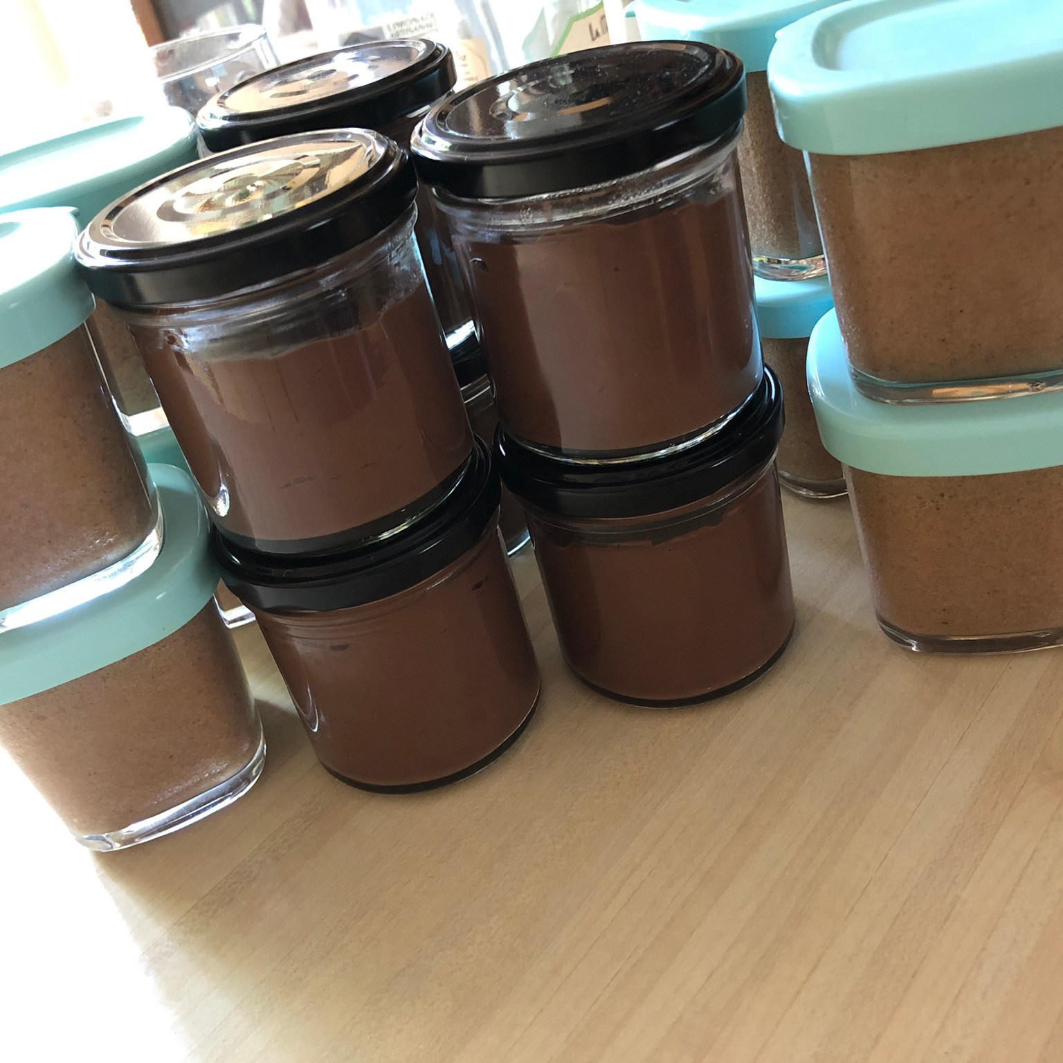A Droite, en prévision d’une visite de mon brother avec sa petite famille, j’ai lancé des crèmes chocolats et des marrons suisses… Félicitation du public! et 0 déchet puisque ce sont mes propres pots que je ré-utilise chaque semaine pour les desserts de la maisonnée