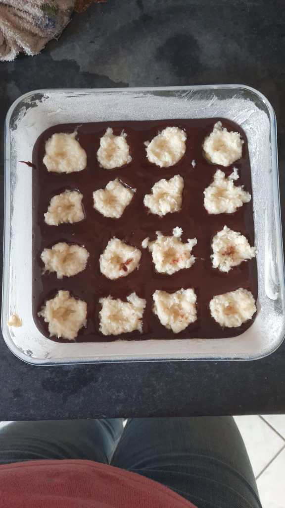 Un mix de brownie et de coeur de noix de coco, ça aussi c’est validé, mais on ne va pas le faire trop souvent surtout quand on n’a plus le droit d’aller bouger son boule au sport… non pas trop souvent